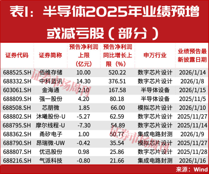 在2025年业绩预告窗口期,半导体板块的表现可圈可点,统计14只已披露2025年年报业绩预告的个股,有11只业绩预告上限为增长,占比近八成。