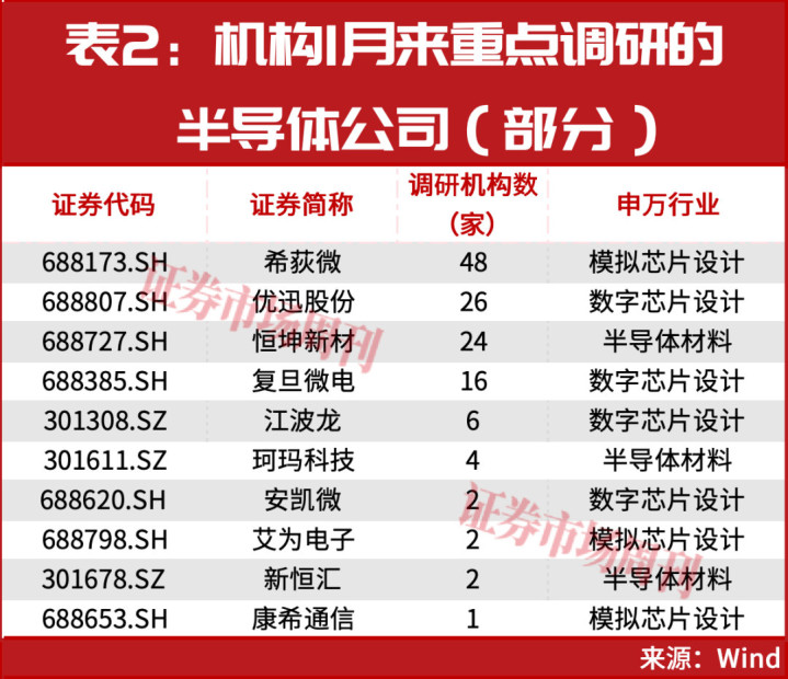 笔者注意到,在半导体公司股价强势走强、业绩扎堆预喜的同时,机构对半导体的关注度也在加强。如今年1月以来,包括希荻微、优迅股份、恒坤新材等在内的机构均已获得了数十家机构调研(见表2)。